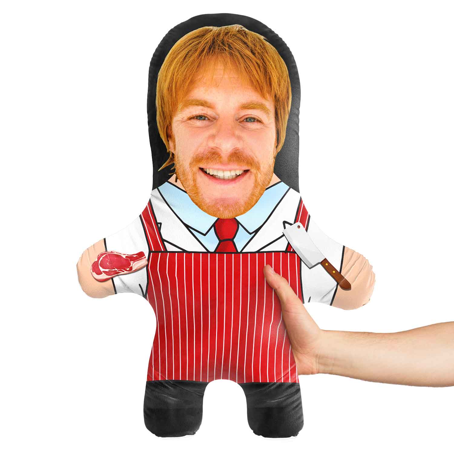 Transform into a hilarious Butcher Face Pillow by uploading a high-quality photo.