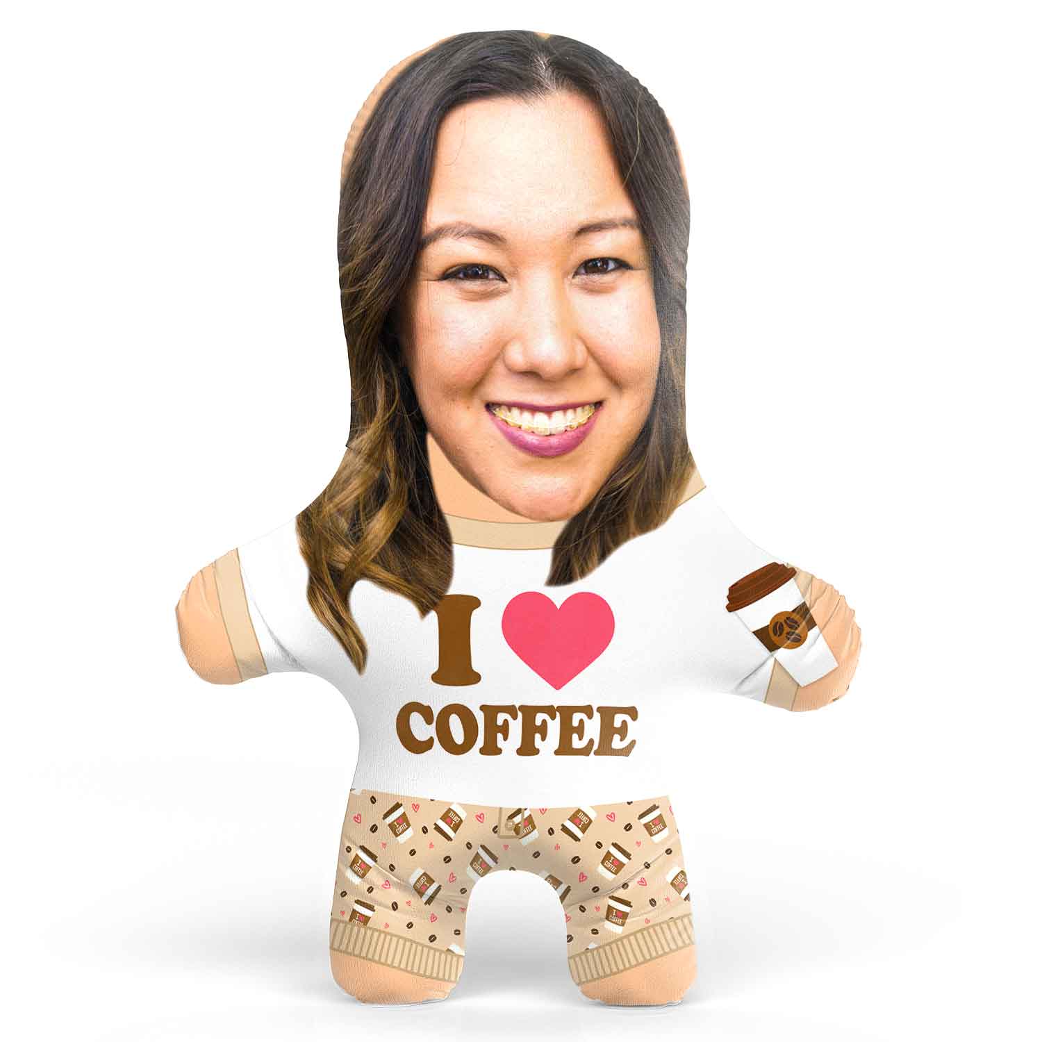 Turn yourself or a loved one into a hilarious I Heart Coffee Face Pillow for the perfect gift.
