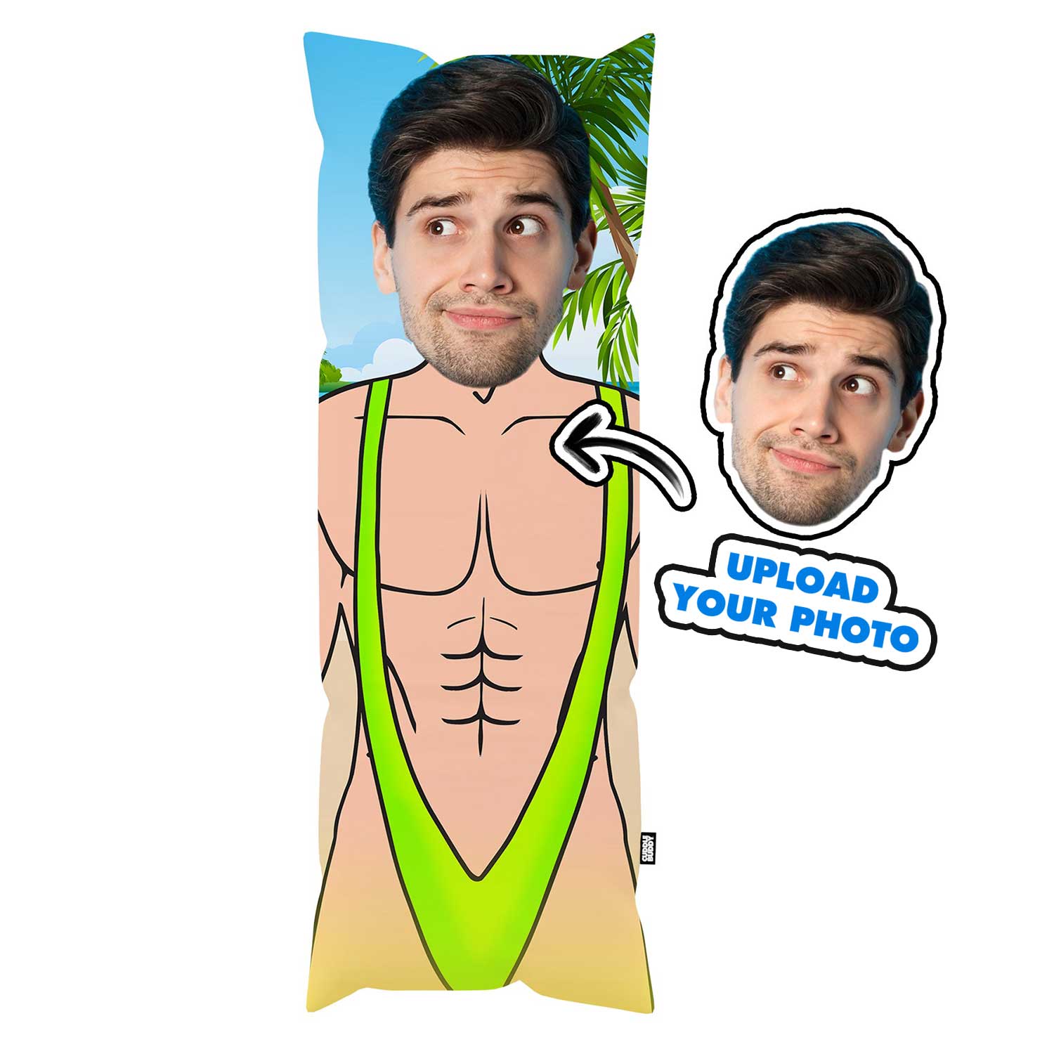 Bring the beach home with a Custom Mankini Body Pillow! Ready for some fun in the sun, or in your living room? Upload a photo and watch as we transform it into a hilarious, oversized mankini-clad body pillow. Perfect for parties, gifts, or just brightening your day, this body pillow is guaranteed laughs!