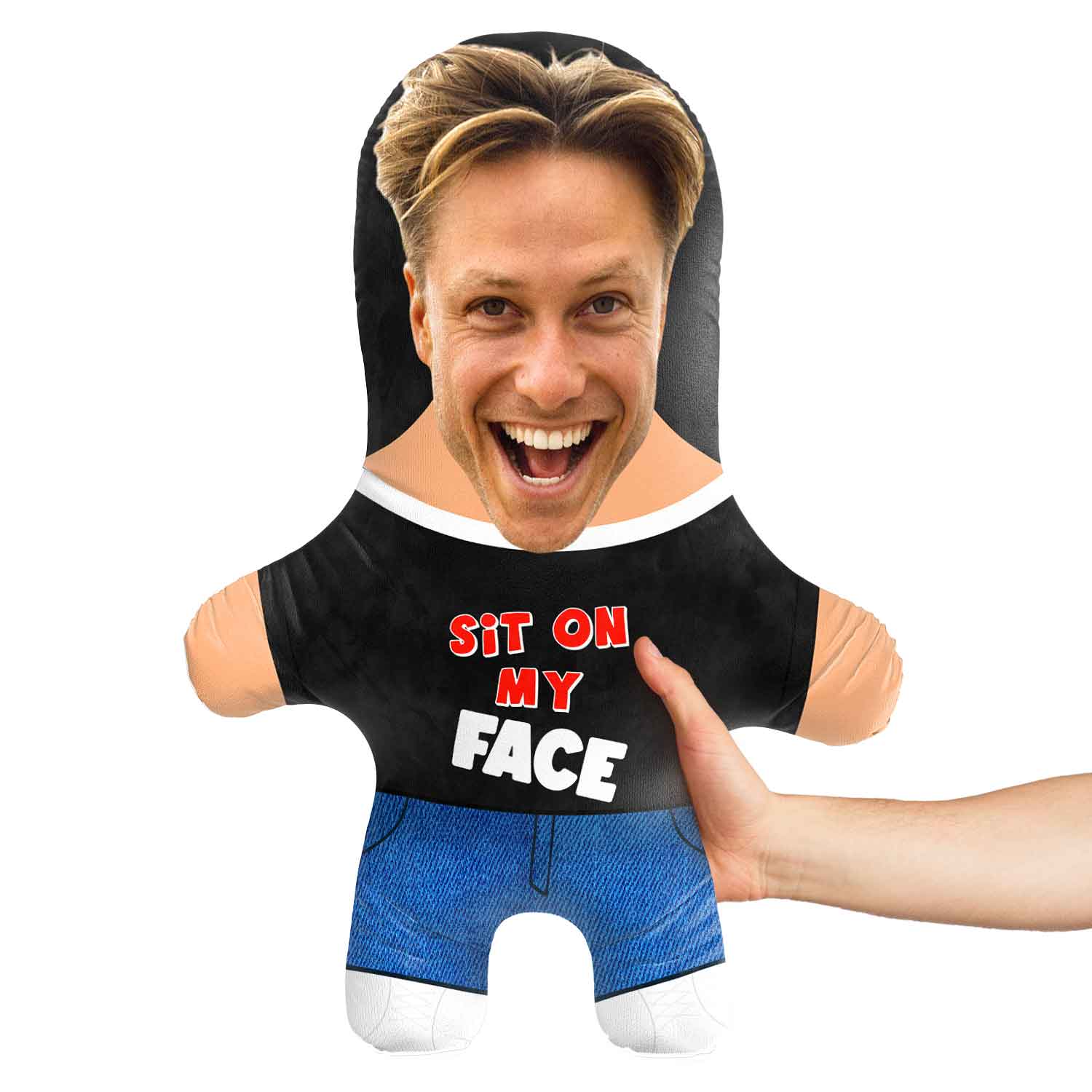 Turn yourself or a loved one into a hilarious 'Sit On My Face' Face Pillow for the perfect funny gift.