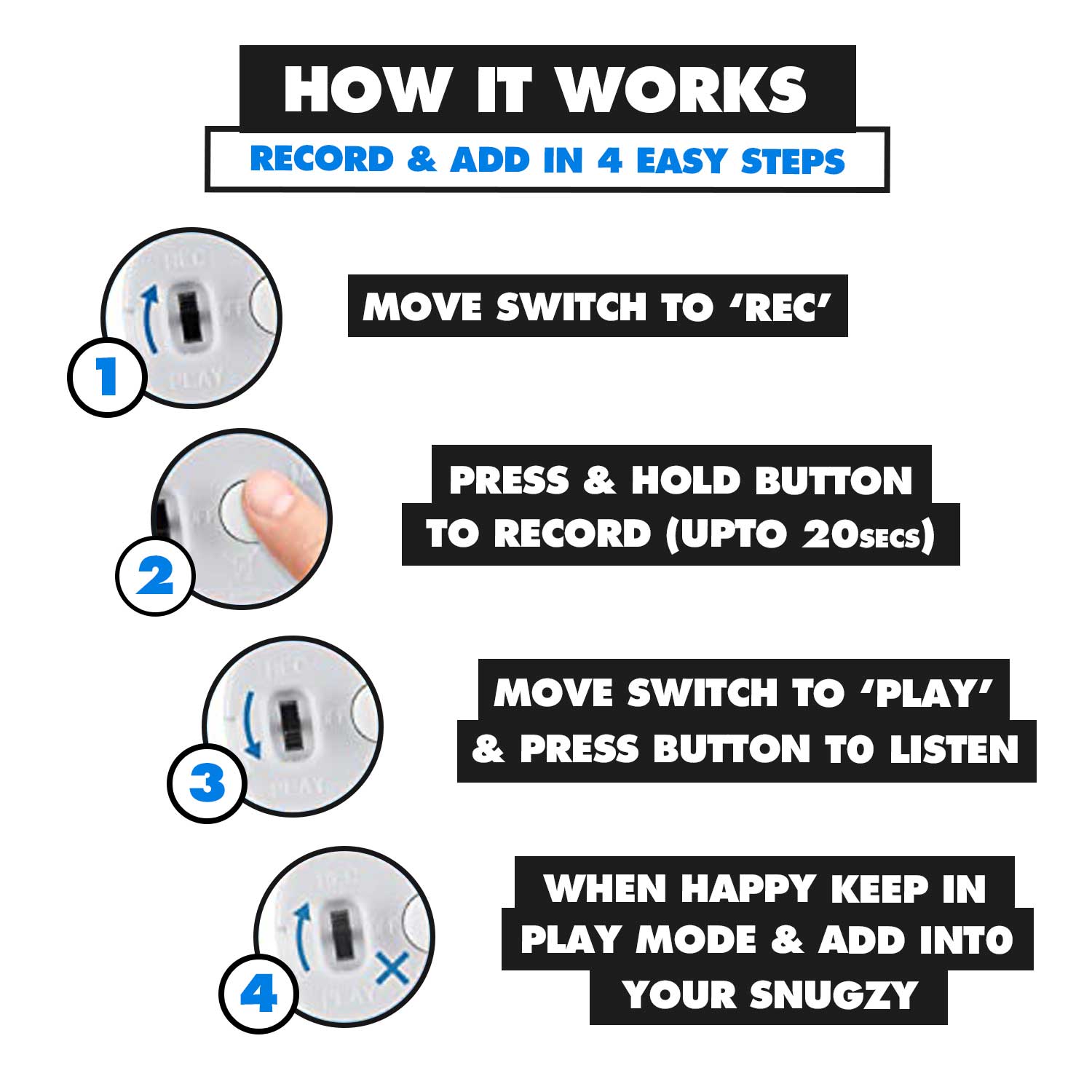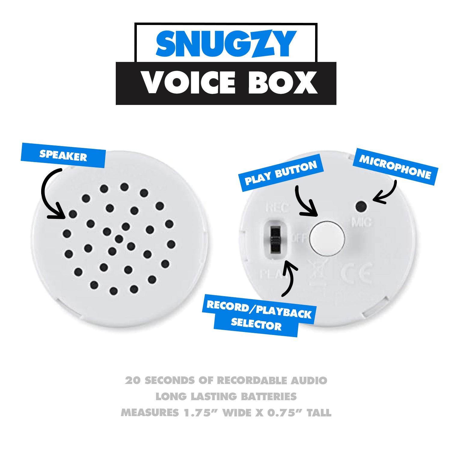 Make your Snugzy extra special with a voice box featuring your own recorded message. Record and re-record a 20-second message and add it to your Snugzy. Simply then Squeeze and hug to play (Please note. this is only possible on Custom Personalised Snugzys)